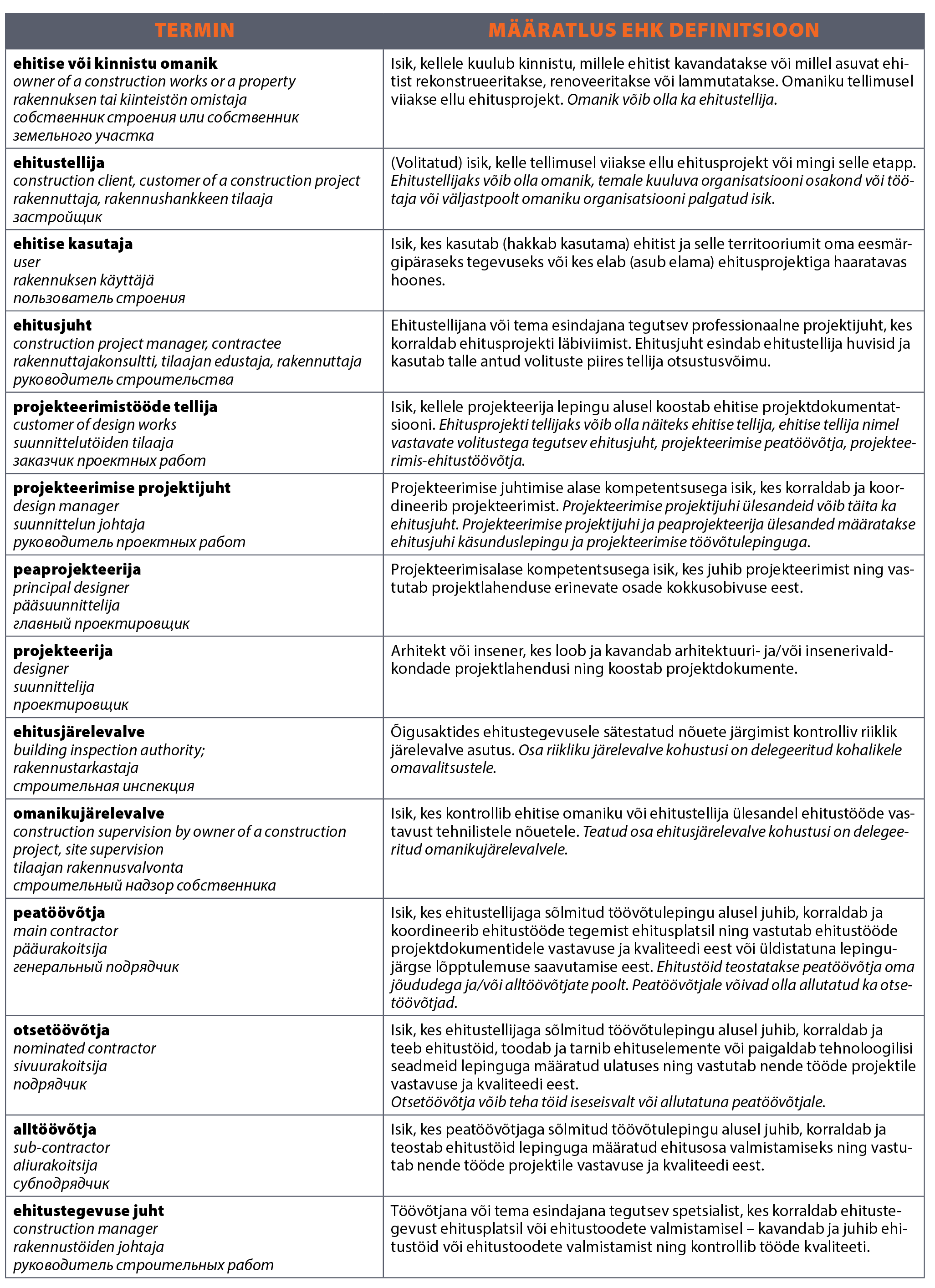 - Selles jaotises olen olnud hädas mitme võõrkeelse terminiga. Esmalt seesama „ehitusjuht“. Pole kindlust, kuidas seda ametit nimetada inglise keeles. Samuti olen segaduses soome keelega – soomlastel on hea sõna „rakennuttaja“, mis osutab ehituste tellimismeeskonnale vastandina ehitajat tähendavale terminile „rakentaja“. Antud juhul olen olnud kimbatuses otsuse tegemisega, jagades „rakennuttaja“ terminit nii ehitustellijale kui ka ehitusjuhile. Teiseks vajavad täpsustamist „ehitise omaniku“ inglis- ja soomekeelsed vasted. Tegelikult on taustal hõljuvaks probleemiks meil selgelt kasutuses oleva jaotuse – ehitised jagunevad hooneteks ja rajatisteks – sisukas tõlkimine nendesse keeltesse.