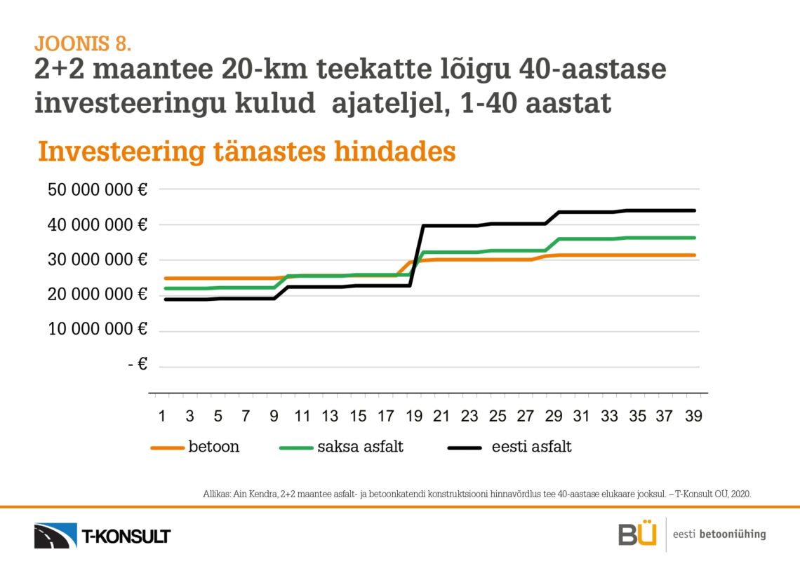 Uuringu põhijärelduseks on, et betoonkatendi kulud on 40% väiksemad kui asfaltkatendil, kui võrrelda võrreldavatel tingimustel 2 + 2 maantee katendi kogu elukaare kulusid (lisaks ehitamisele kõik hooldused, remondid, rekonstrueerimised). Betoonkatendi hooldus- ja remondikulud on ligi neli korda väiksemad kui asfaltkatendil (vt Joonis 8).