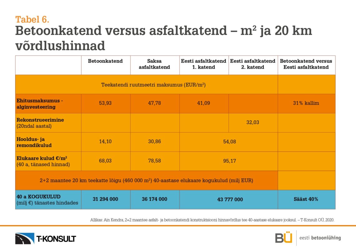 Sellisele järeldusele jõudis värske T-Konsult OÜ uuring „2 + 2 maantee asfalt- ja betoonkatendi konstruktsiooni hinnavõrdlus tee 40-aastase elukaare jooksul” (T-Konsult OÜ, Ain Kendra). „Eesti on asunud kiirendatud korras välja ehitama kolme riigi põhimaanteed,” ütles Eesti Betooniühingu juhatuse liige Kalle Suitslepp. „Just need on maanteed, mis vajaksid palju suurema kandevõimega, pikaajalist, vastupidavat, keskkonnasäästlikumat ja ka odavamat betoonkatendit.”