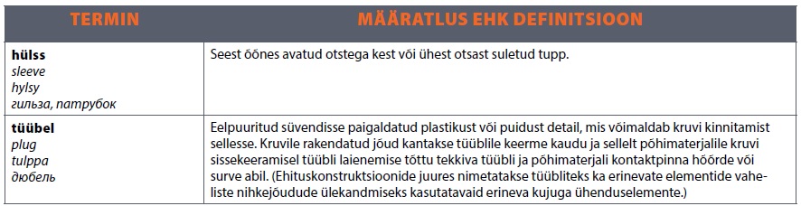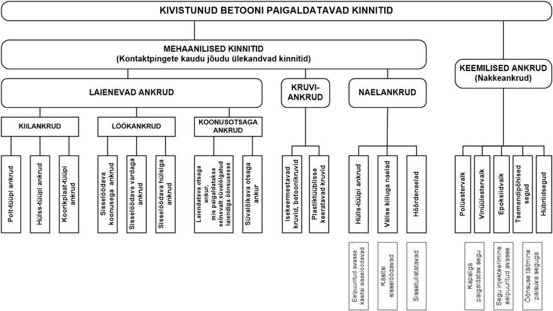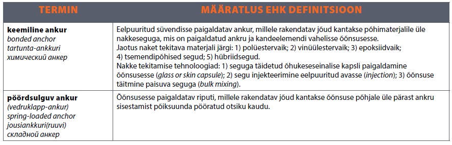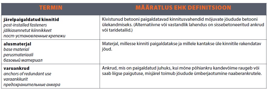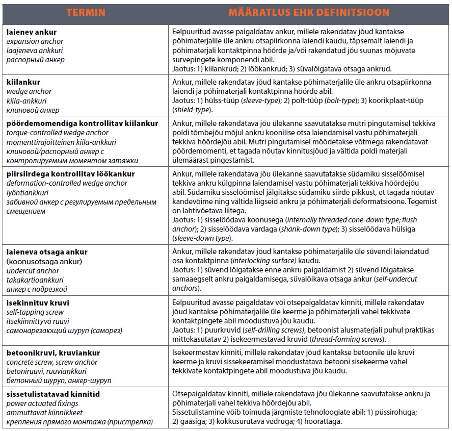 Järgnevalt olen pakkunud endapoolse jaotuse ning tabeli terminite ja määratlustega. Seda tööd tehes konsulteerisin suuremate kinniteid tarnivate firmade Hilti ja Würthi vastava ala spetsialistidega. Täpsustusi lisandus ka eelmainitud koolitusel osalenud asjatundjate poolt.