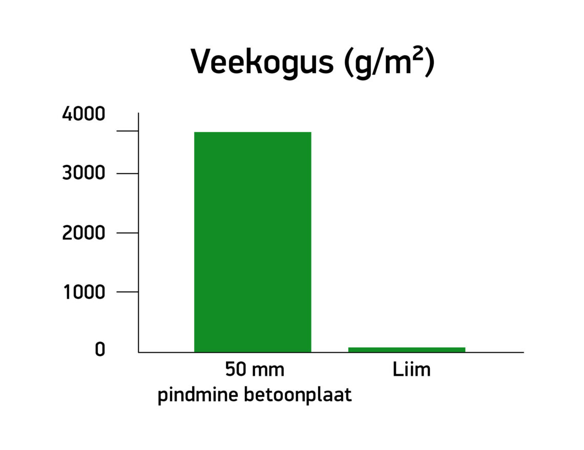 Niiskus, mida veepõhine vaibaliim aluspinda kaasa toob, tekitab sageli diskussiooni, ent tegelikult ei tekita aluspinna pinnaniiskuse hetkeline tõus paigaldamise käigus siseõhuprobleeme. Juuresoleval graafikul on võrreldud 50 mm paksuses pindmises betoonplaadis (85% RH) sisalduva vee kogust vaibaliimist tuleva vee kogusega.